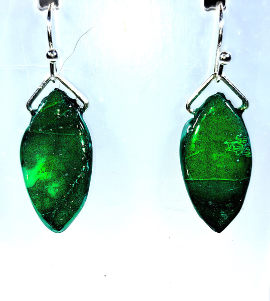 Emerald inks on translucent clay give these earrings a glow when light passes through them.  Lightweight and stylish, they area joy to wear and will garner many compliments.  All metal is stainless steel and hypoalergenic.